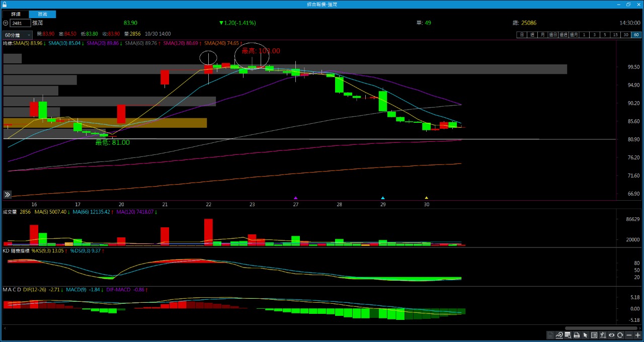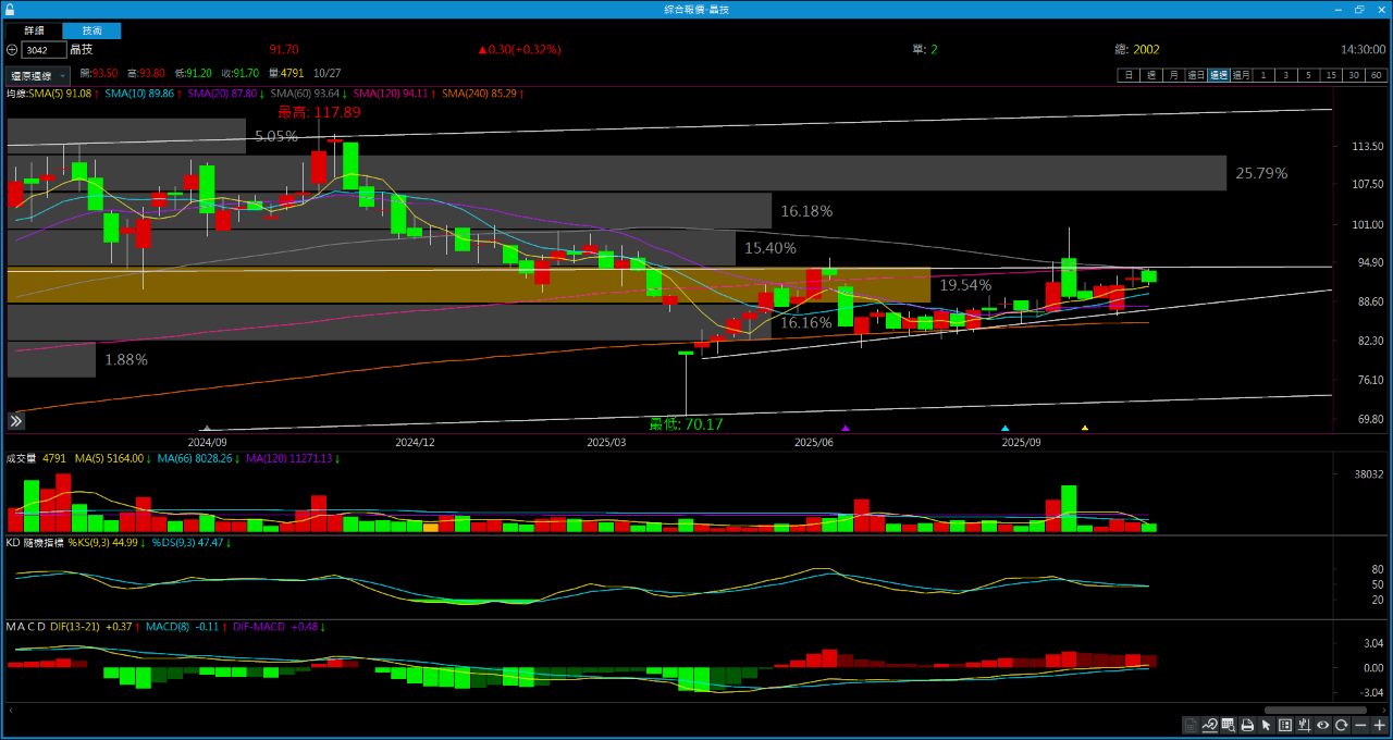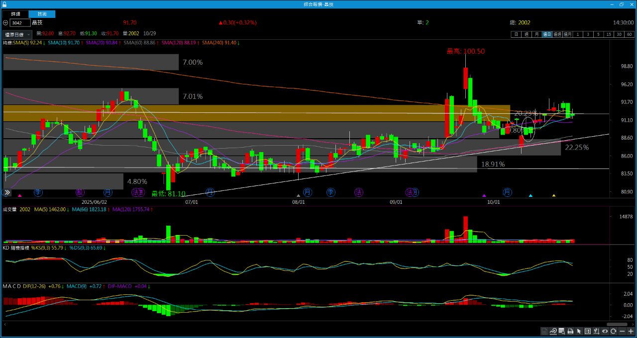 晶技的支撐在圈起來地方,原因就是在上升趨勢的時候有支撐,隔天直接補回缺口,在一次打角測試收盤收上89,我認為這裡就是支撐,日線看不懂,周線就知道壓力在哪了,日線本來就常常會騙線,周線就很好判斷,目前均線正在糾結中,60周下降中,5~20多頭排列,其他均線就是正在整理當中