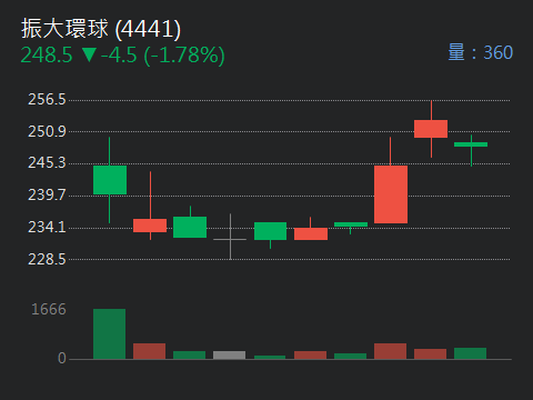 振大環球(4441):今天早盤有點像婷婷醬在剛起床,有點不想起的感覺,早盤低開後盤中在水面下呈現震蕩整理格局,尾盤下跌1.78%來到248.5元。技術面看到股價跌破均線,短期動能有轉弱趨勢。婷婷醬說現在就先乖乖當個吃瓜群眾,不要急著衝刺,等它走穩點,再來期待它閃閃發亮也不遲啦!