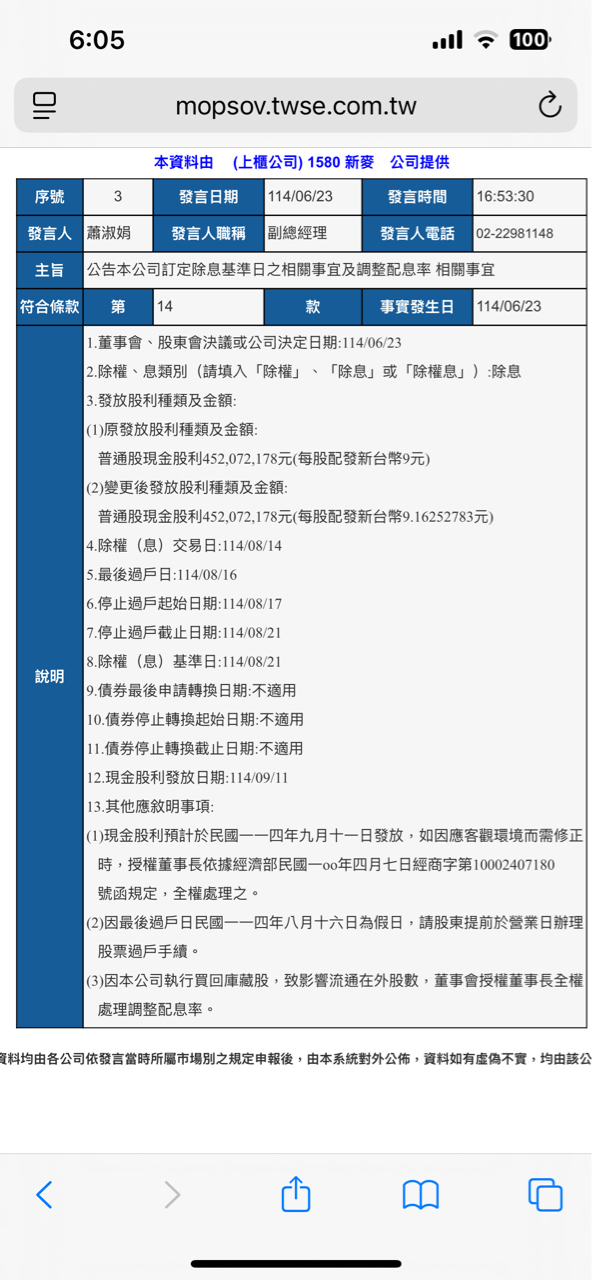 新麥最大敗筆是EPS由前年的12.02升至去年的13.59,但股息配發卻依舊維持一樣9元,我想散戶股東多少有些失望。 新麥不是台積電那樣的高成長股,會存的都是看上它的高股息,可惜公司捨不得維持前年的股息配發率,如果配個10元,股價反應應該會不一樣,未來一旦營收開始反轉,股價恐只能原地踏步。 希望鄉民董事能向公司反應一下,個人意見:)